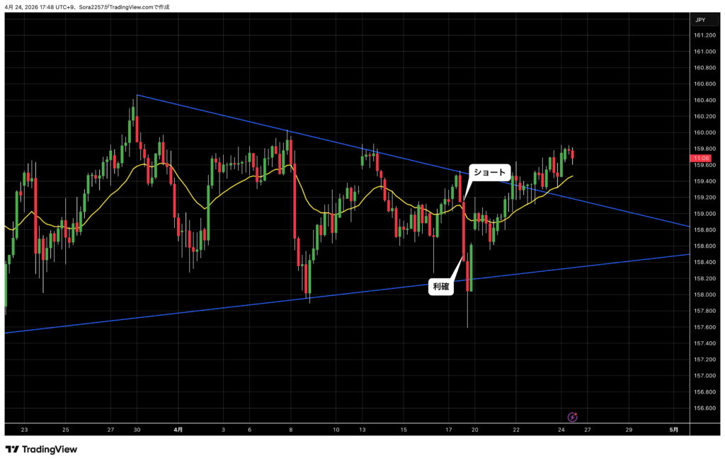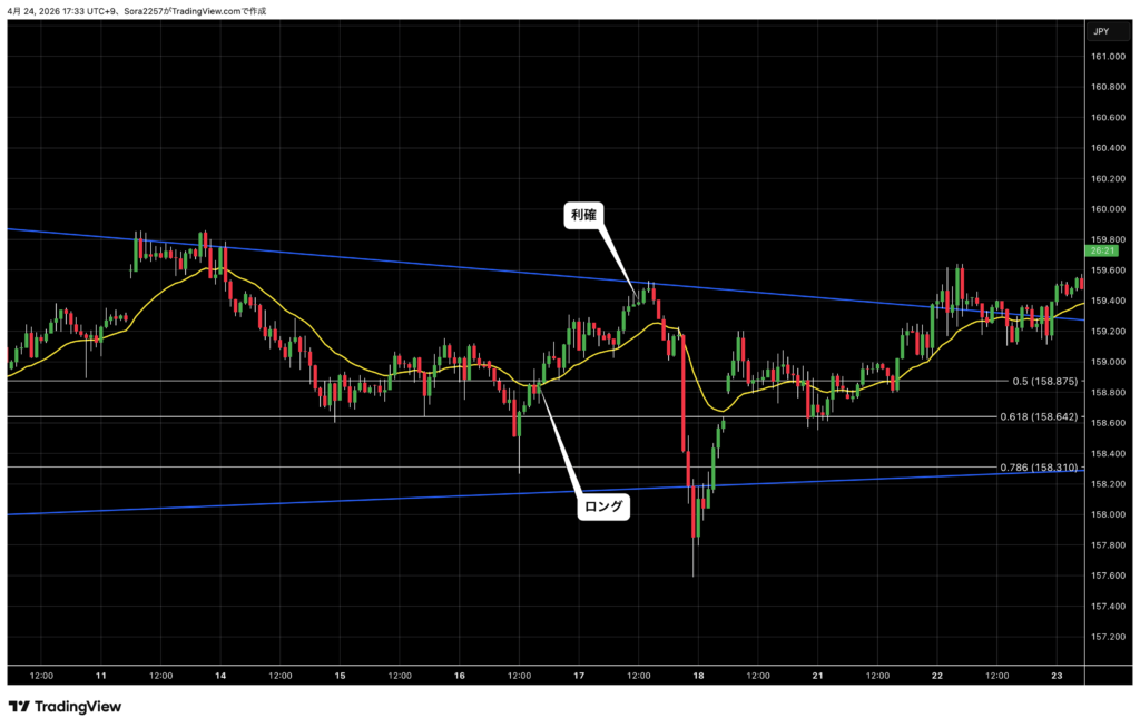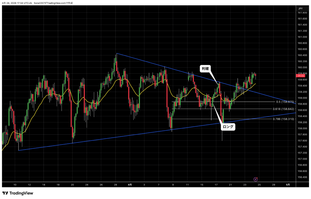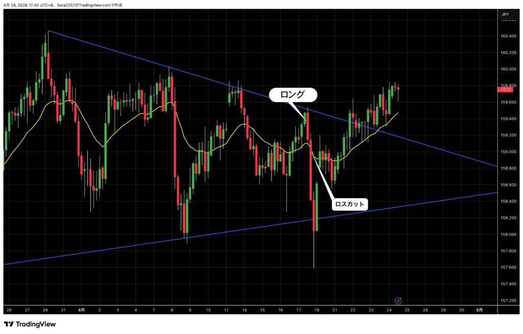 三角保合いを抜ける方に可能性を感じ、1時間足のトレンドライン付近で