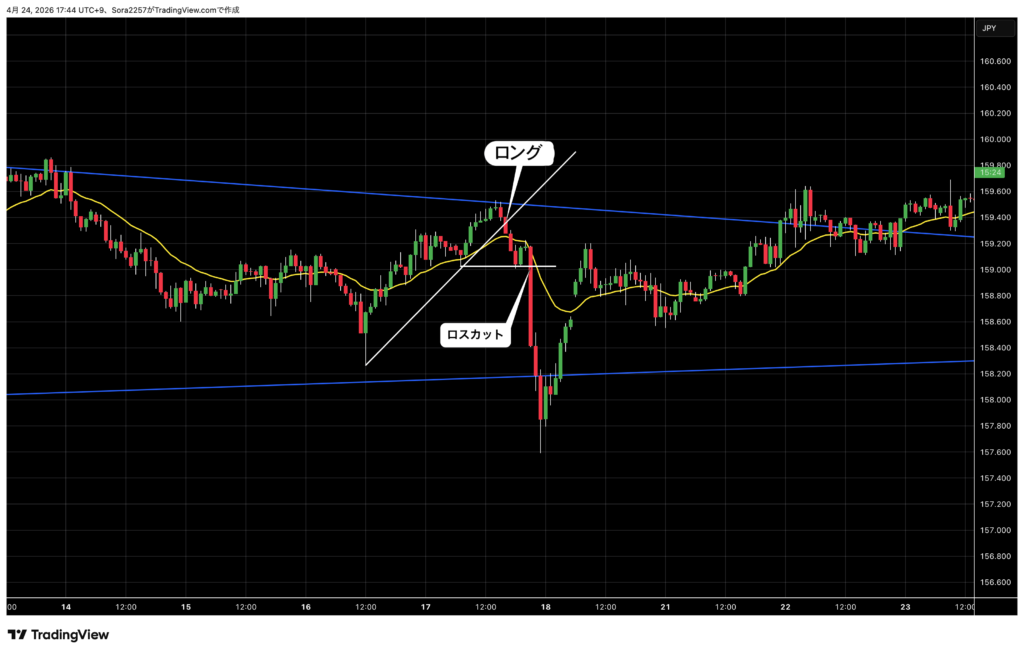 負けはしたが、三角保合い高値付近でのロングエントリーだったので